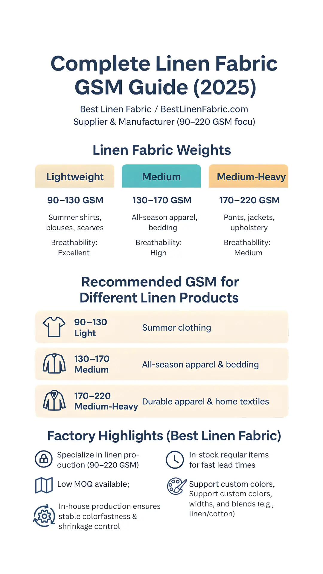 At BestLinenFabric.com, our production specializes in 90–230 GSM linen, covering the full range needed for apparel, home textiles, and commercial use.