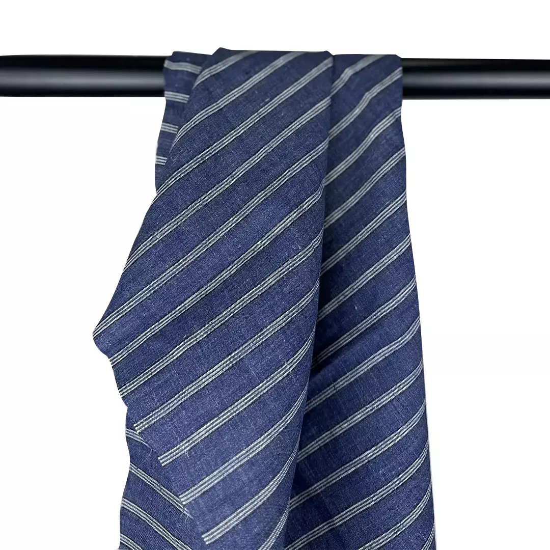 This 100% linen fabric features a sophisticated Delavé yarn-dyed finish with classic diagonal stripes, offering a subtle melange effect and a timeless appeal. At 175gsm and 140cm wide, it is versatile for both apparel and light home textile applications.